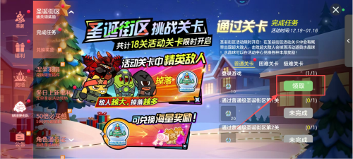 4、进入圣诞街区挑战关卡界面,查看已通关的关卡数量,并在完成任务点击领取奖励。