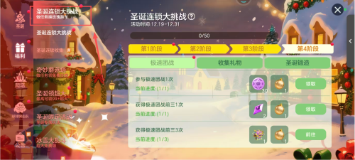 2、打开圣诞挑战活动界面,查看当前任务进度,点击界面左上角的按钮,领取已完成任务的奖励。