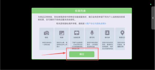 1、权限列表确认 、界面弹出权限列表说明,阅读各项权限介绍后,点击标注的 “确定” 按钮完成权限确认。