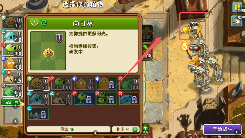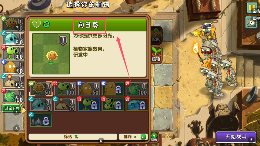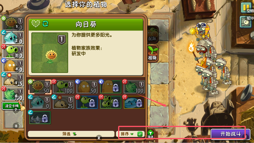 2、顶端“选择你的植物”提示旁配备多维度排序功能,左侧详细展示着包括消耗数值在内的关键属性,通过条件筛选能精准定位目标单位,这套设计大幅缩短了战前准备时间。