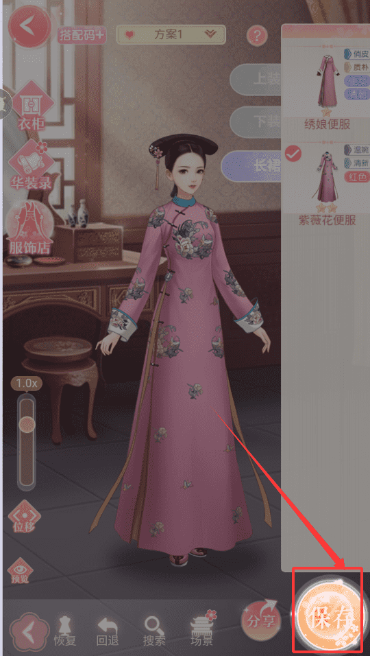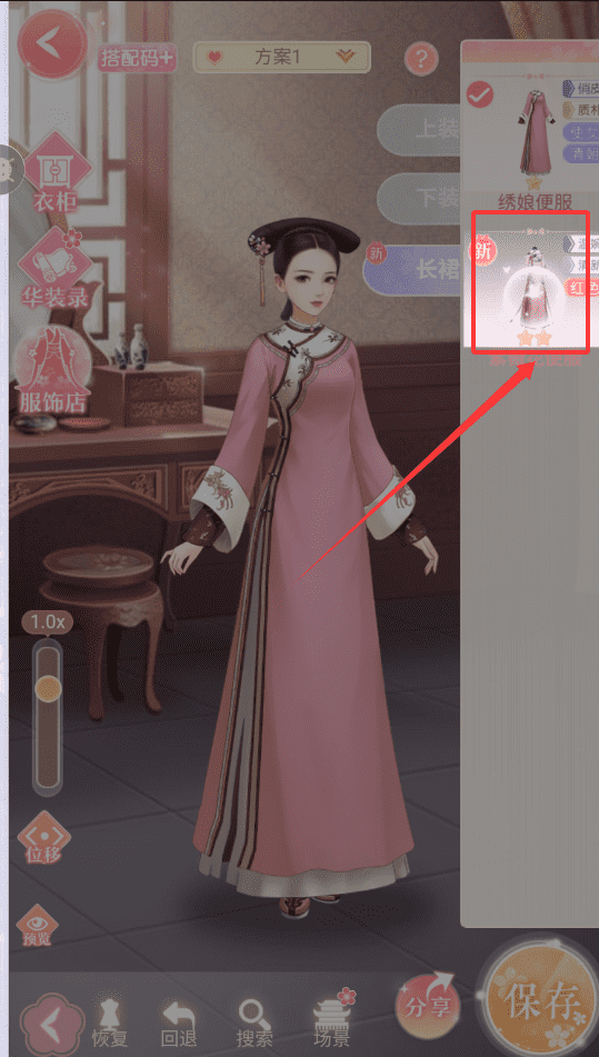 3、让衣服贴合身形,每加一件都可用恢复回退调整,结合场景预览整体风格,满意后保存搭配码,之后就能一键换装啦。