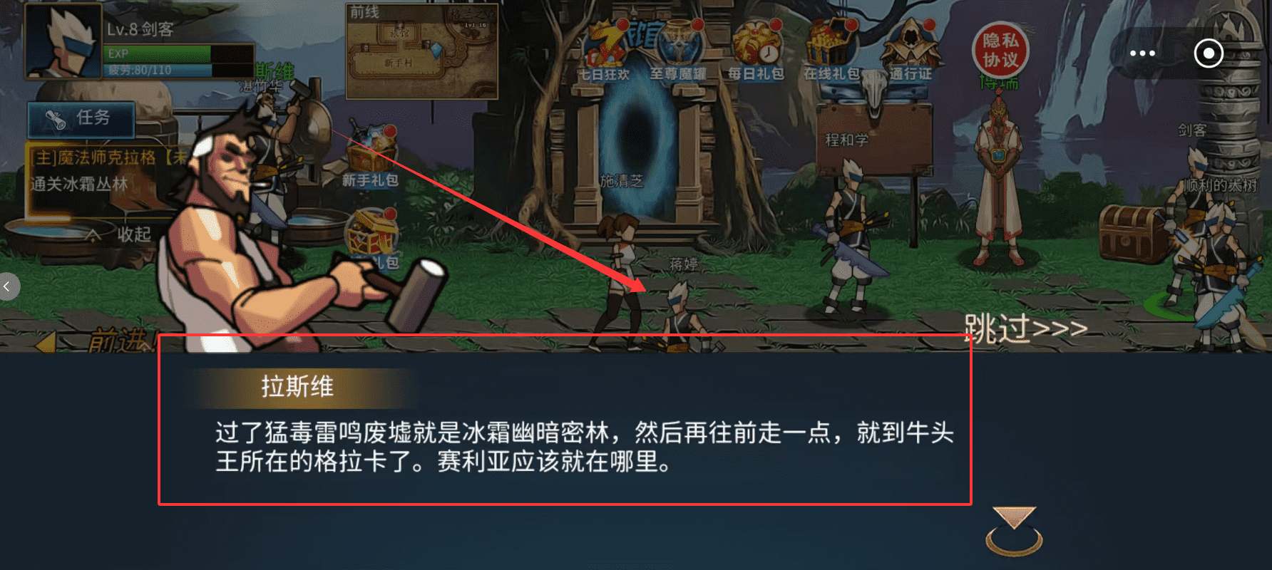 2、像“魔法师克拉格”的任务会指引你前往“冰霜丛林”,并提示后续地图如“格拉卡”的位置,跟着描述走就不会迷路了。
