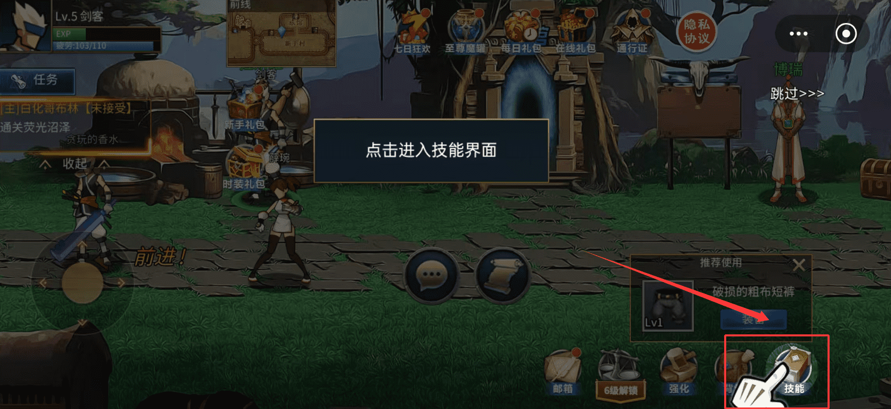 2、初期系统会“推荐使用”一些基础装备,比如“破损的粗布短裤”,虽然属性普通,但前期凑合着用没问题,后续再慢慢更换。