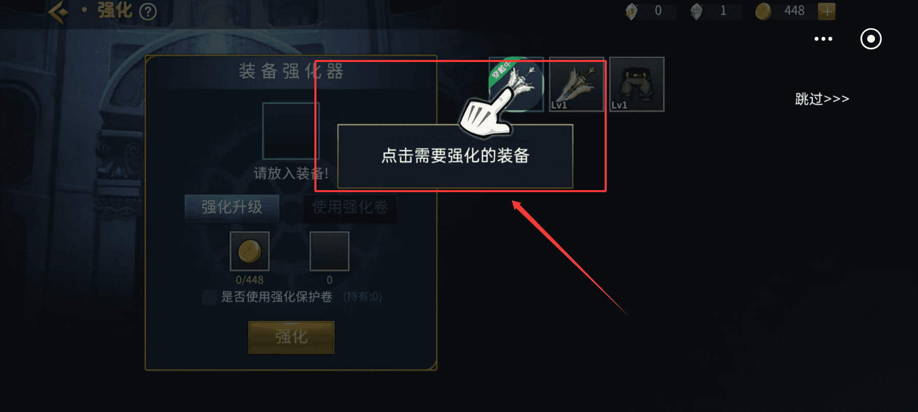 4、不过卷轴数量显示为“持有:0”时,就表示暂时用不了。如果不想看强化动画,也可以点右下角的“跳过>>”快速结束过程。