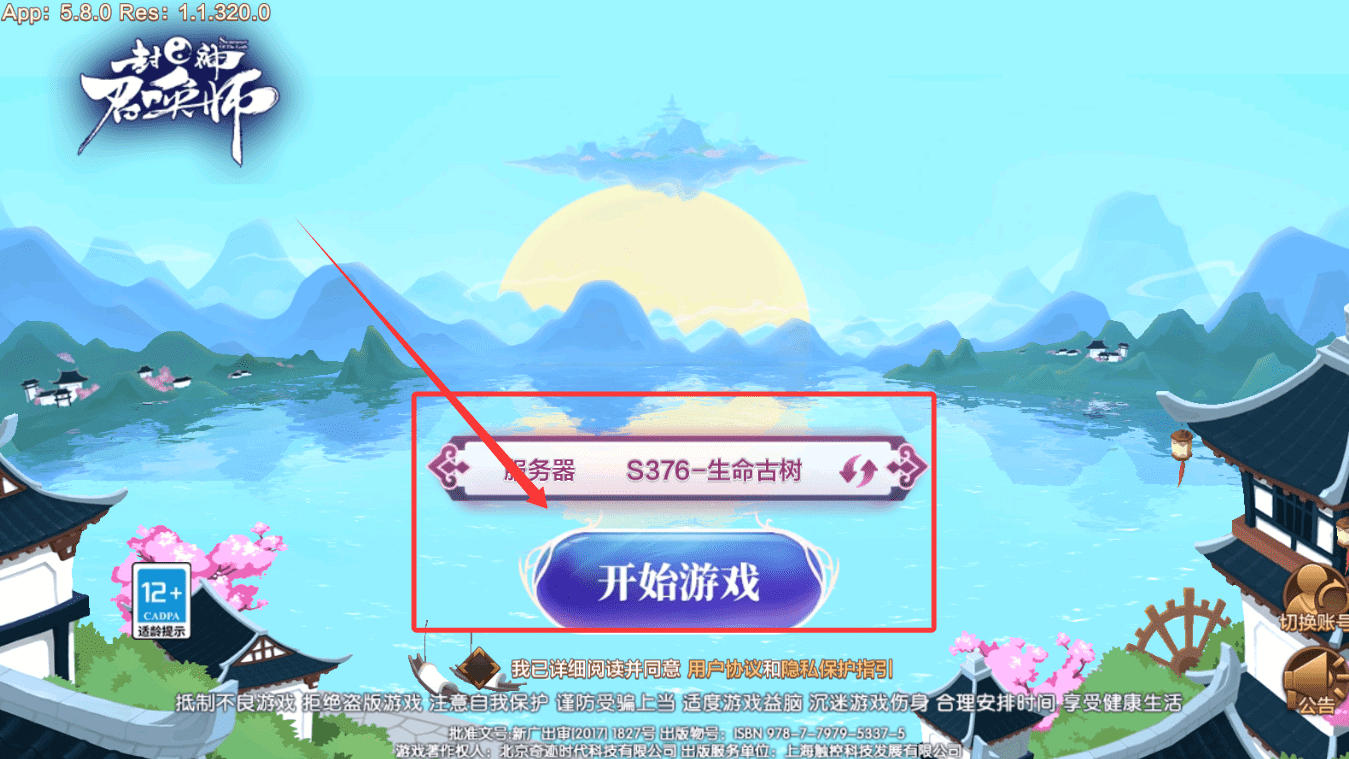 1、在游戏启动初始,首先需确认当前版本与服务器信息,例如版本号为5.8.0,随后选择“S376-生命古树”等服务器。仔细阅读用户协议与健康提示后,点击开始游戏进入下一环节。