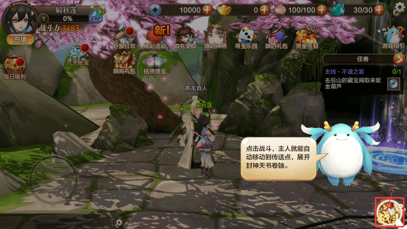 3、进入游戏主界面,围绕角色解秋莲展开剧情,主线任务会明确指引下一步行动。例如接到“不速之客”任务后,点击战斗按钮便能自动寻路至后山藏宝阁,获取关键道具紫金葫芦。
