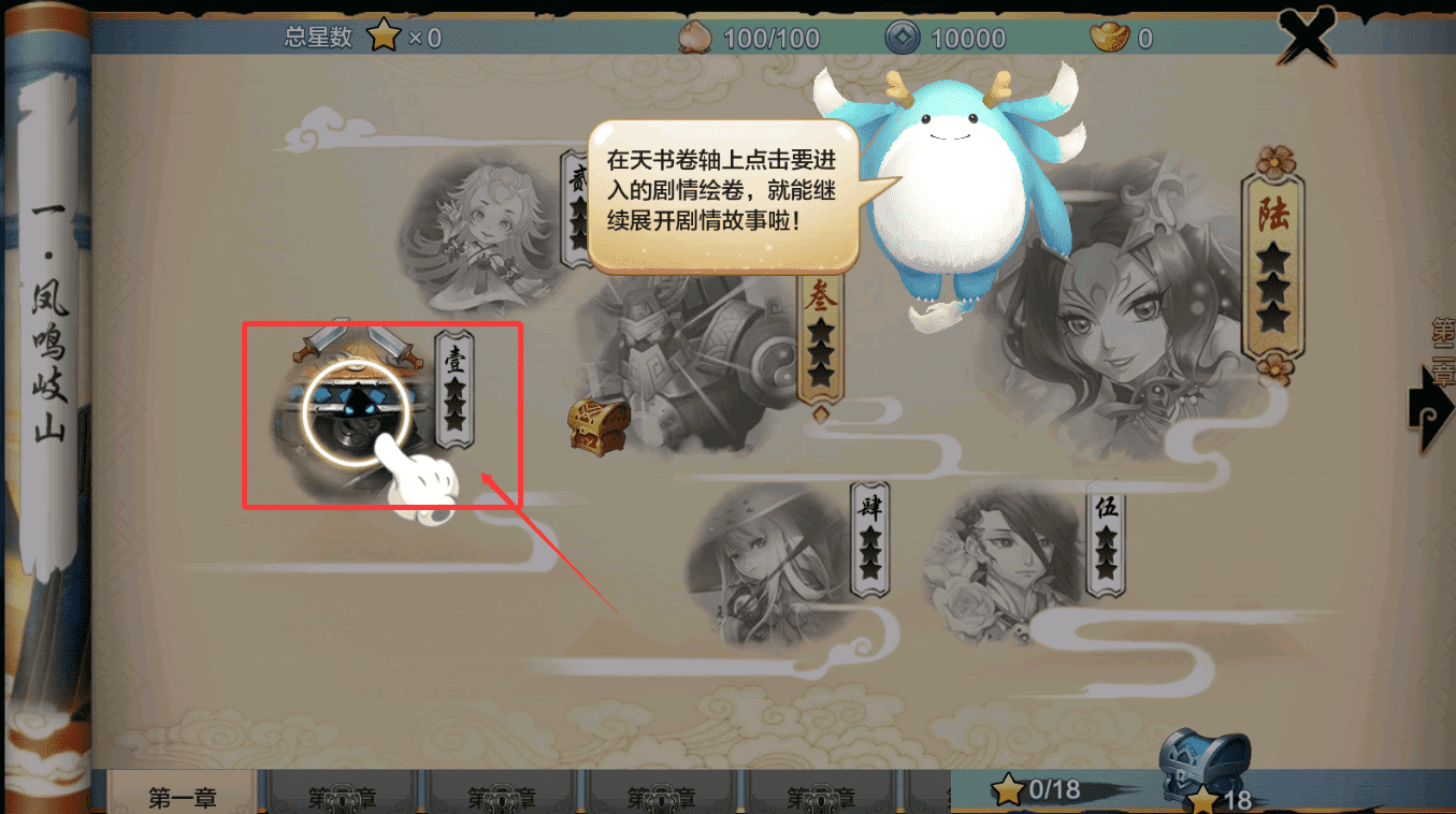 4、完成任务目标后将展开封神天书卷轴,此时可点击进入剧情绘卷界面。该界面以章节形式呈现,例如第一章包含多个小节,点击对应绘卷即可深入体验连续的剧情故事与发展。
