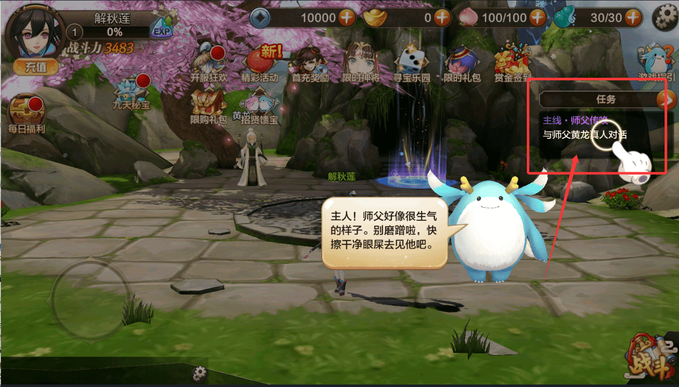 3、角色创建完毕后进入游戏世界,界面将显示多种活动入口,例如开服狂欢、限时礼包等。主角解秋莲需根据主线任务指引,首先前往师父黄龙真人处接受传唤,了解剧情初步背景。