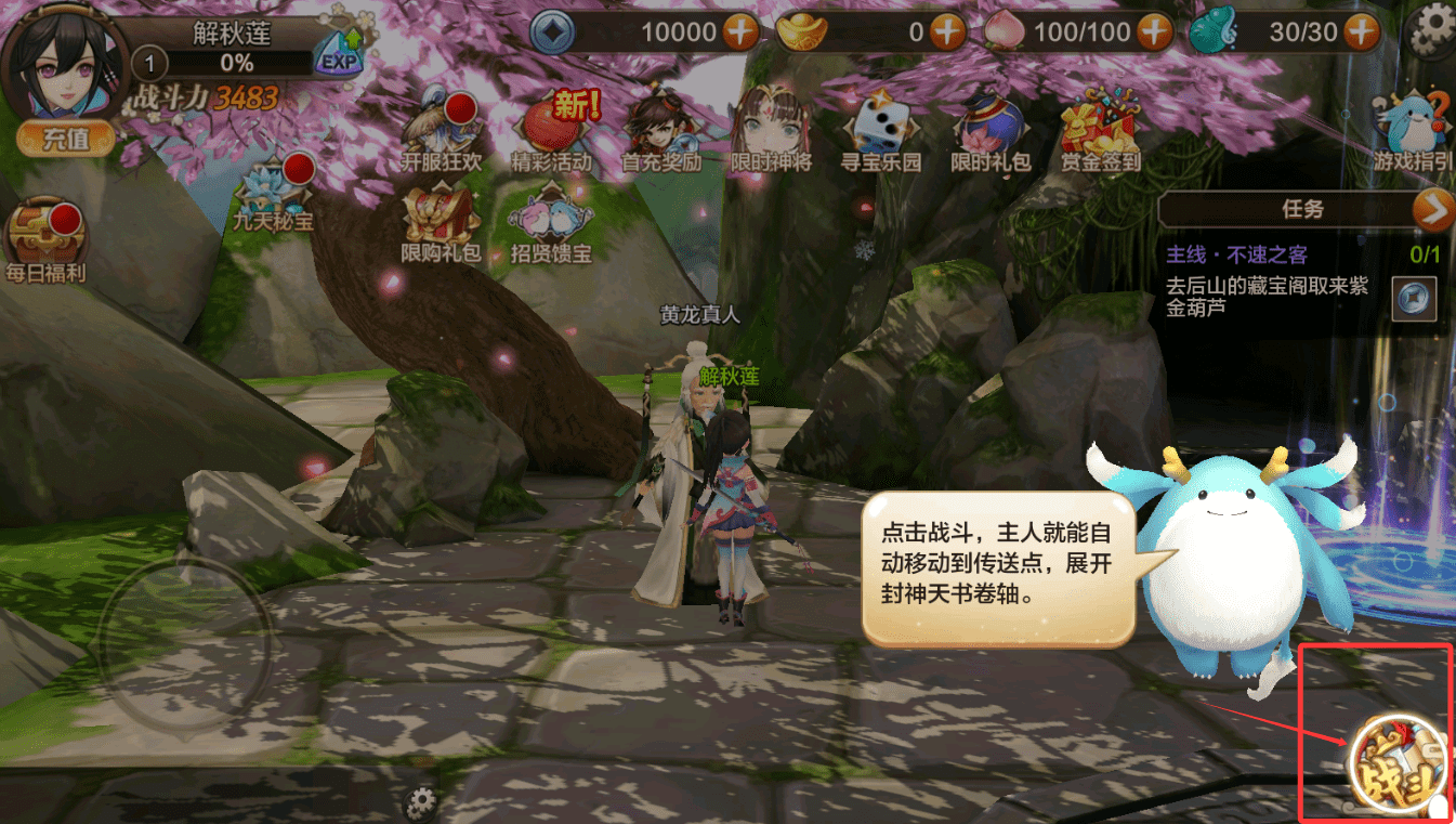 4、接到首个主线任务后,可依据任务描述自动寻路至目标地点。例如前往后山藏宝阁获取紫金葫芦,过程中可点击战斗按钮实现自动移动与触发剧情,逐步展开封神天书相关卷轴。