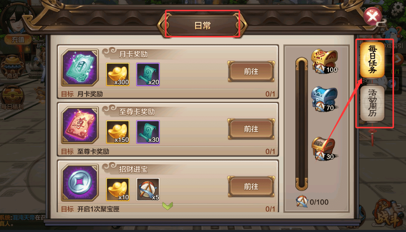 1、游戏主界面整合了多项日常活动入口,例如“每日福利”与“日常任务”。完成指定任务如开启聚宝匣,或领取月卡、至尊卡奖励,是稳定获取经验、铜钱与元宝等基础资源的有效途径。