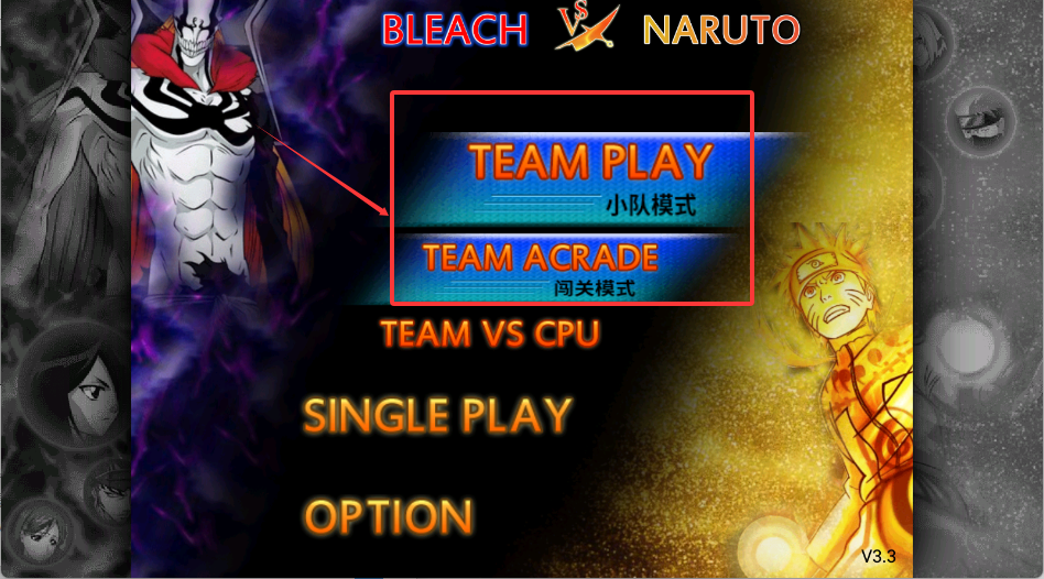 1、启动游戏,主界面背景是酷炫的动漫风格,两侧分别是《BLEACH》和《NARUTO》的代表角色。中间是四个核心功能按钮,最显眼的是“TEAM PLAY”小队模式。
