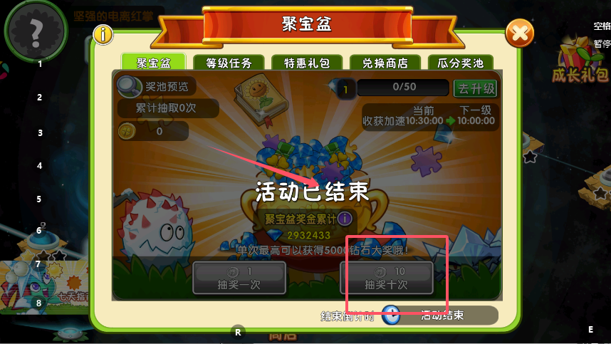 2、在聚宝盆主页面,选择单次或十次抽奖操作,每次抽奖都会累计次数,这些次数是提升瓜分奖池排名的依据,同时聚宝盆等级可通过成长值升级,等级越高奖励收获速度越快。