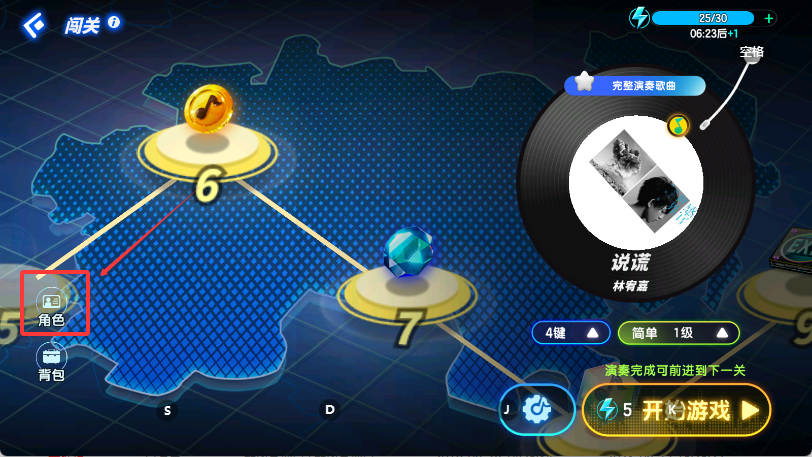 闯关版《节奏大师》不仅基于已有的传统玩法,更加入了闯关挑战的新玩法,不但有普通闯关,还有玩家可以在选择“闯关模式”的玩法后进行打歌闯关,每一关都将有不同的完成条件,消耗一个闪电形的“体力”则可进行闯关挑战。达成该关卡的完成条件,则闯关成功,当然,如果闯关的过程中遇到了困难,玩家也可以通过使用金币购买的道具辅助通关,甚至花费少量的金币直接通关。更值得一提的是,玩家每闯5关,都有资格开启一个宝箱,宝箱中不仅会有“体力”、“金币”和“道具”这样的奖品,更可能获得 “隐藏歌曲”和“奖励歌曲”。