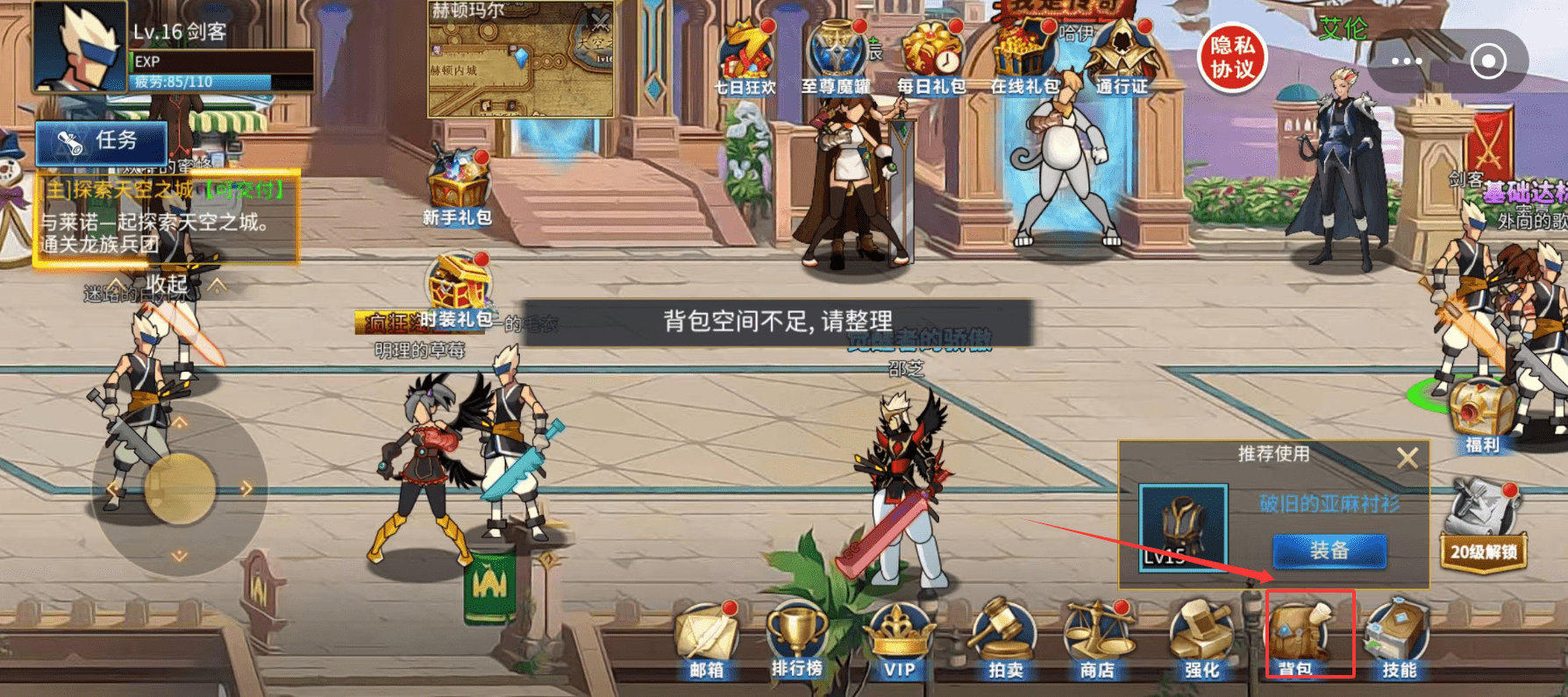 4、注意主界面提示如“青铜空间不足”,及时整理背包或使用扩充道具,这样在完成日常任务和探索时就不会被空间问题困扰了。