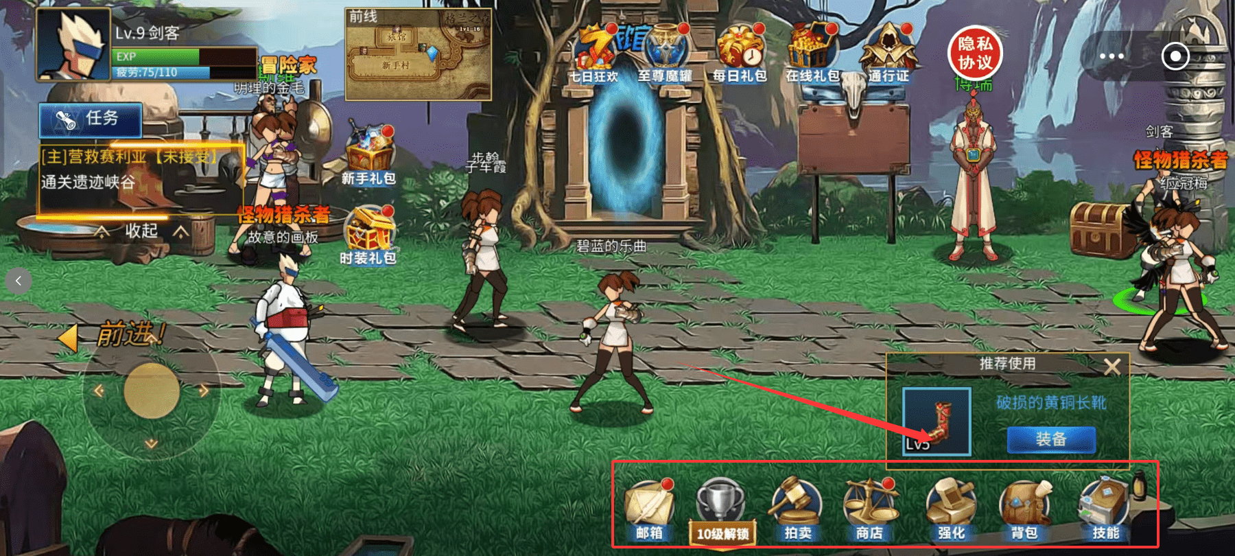 3、接着可以整理背包,检查装备比如“破损的黄铜长靴”,并提前了解10级后解锁的拍卖、强化等功能。