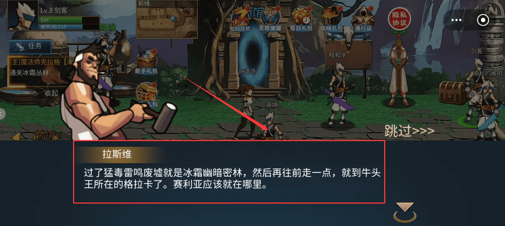3、接取主线任务并跟随指引前往对应地图,比如图中任务提示需通关冰霜丛林,这是推进主线的关键步骤,记得按地图等级顺序挑战。