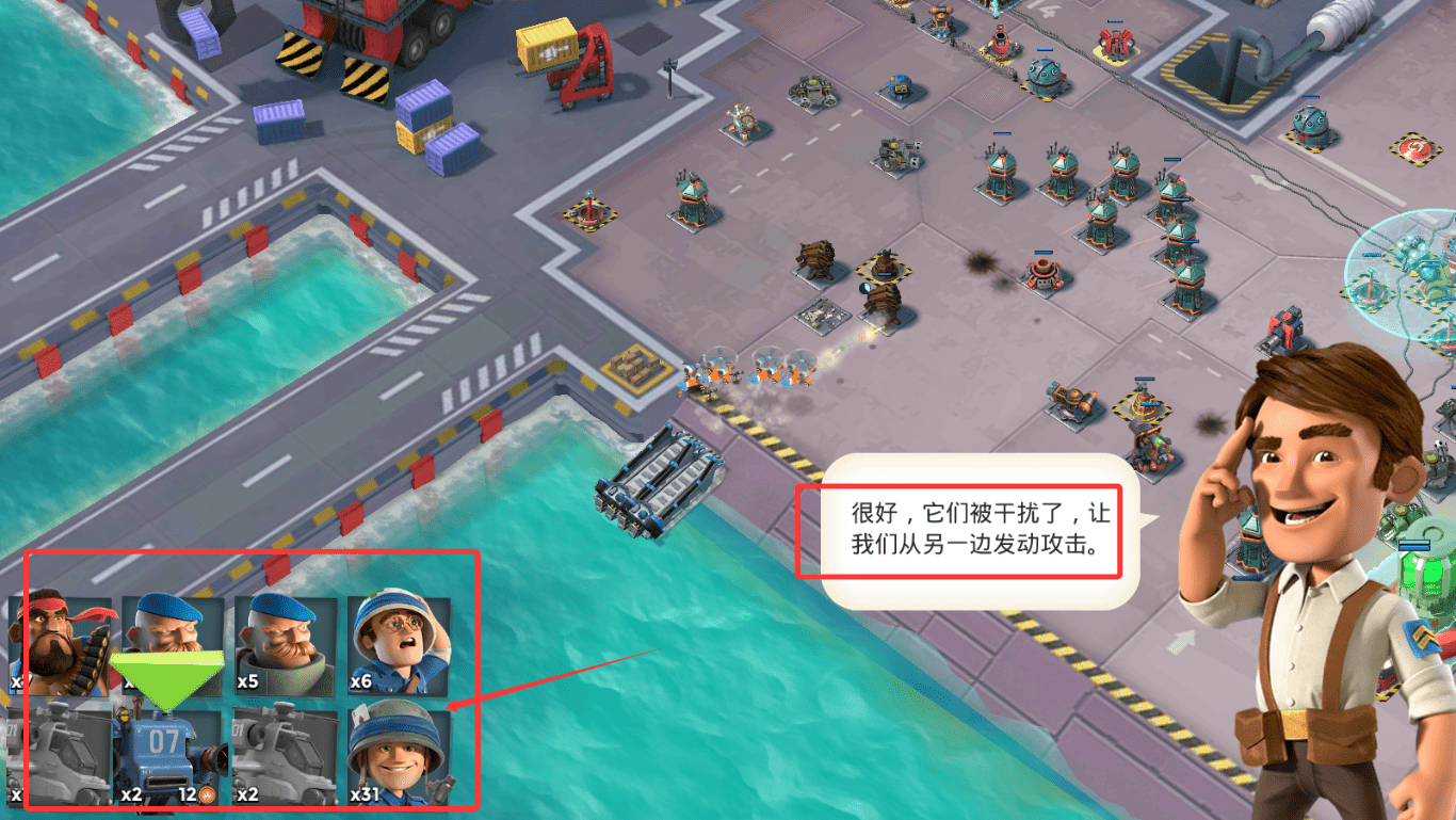 《海岛奇兵》从沙滩指定范围内登陆。然后在海面上有战舰提供导弹、医疗支援,同时还能释放引导弹进行实时打击目标指挥。至于坐着登陆艇成功冲上岸的士兵,全自动战斗,会优先攻击最近的建筑,这时就需要你引导他们集中火力,打掉敌方防御工事先。最后,只要摧毁敌人的司令部就能引爆敌人整个基地,获得胜利,拿到战利品。