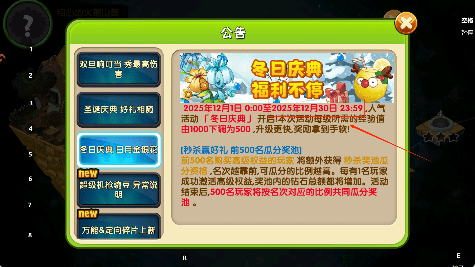 1、每天上线后,在游戏主界面的“公告”区找到“十二月签到奖励”图标,点进去就能看到排列整齐的奖励格子,里面放着金币、钻石、植物碎片和宝箱等各种好东西。
