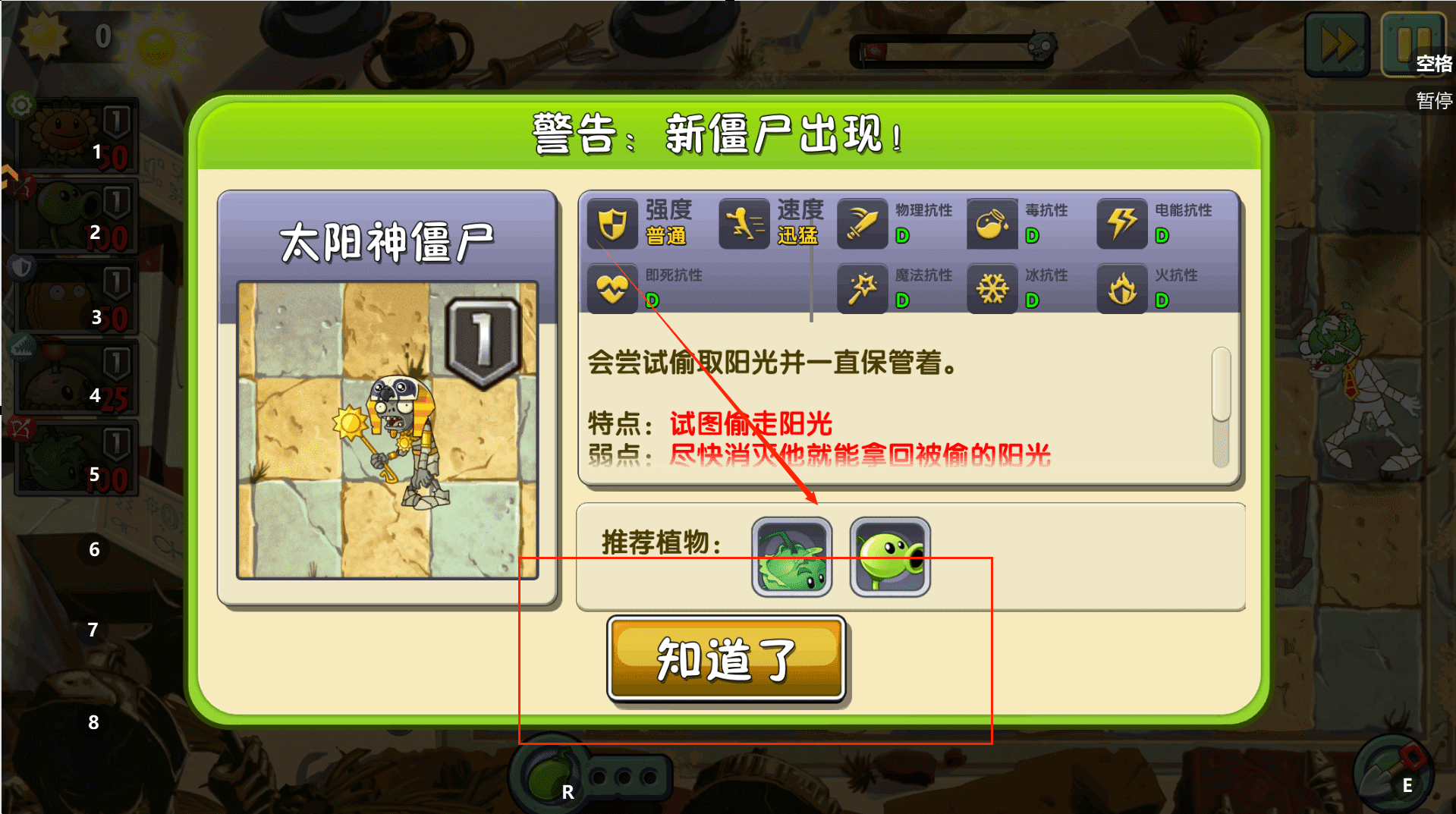 1、遇到太阳神僵尸,使用推荐植物迅速消灭它,以拿回被偷的阳光并继续游戏。