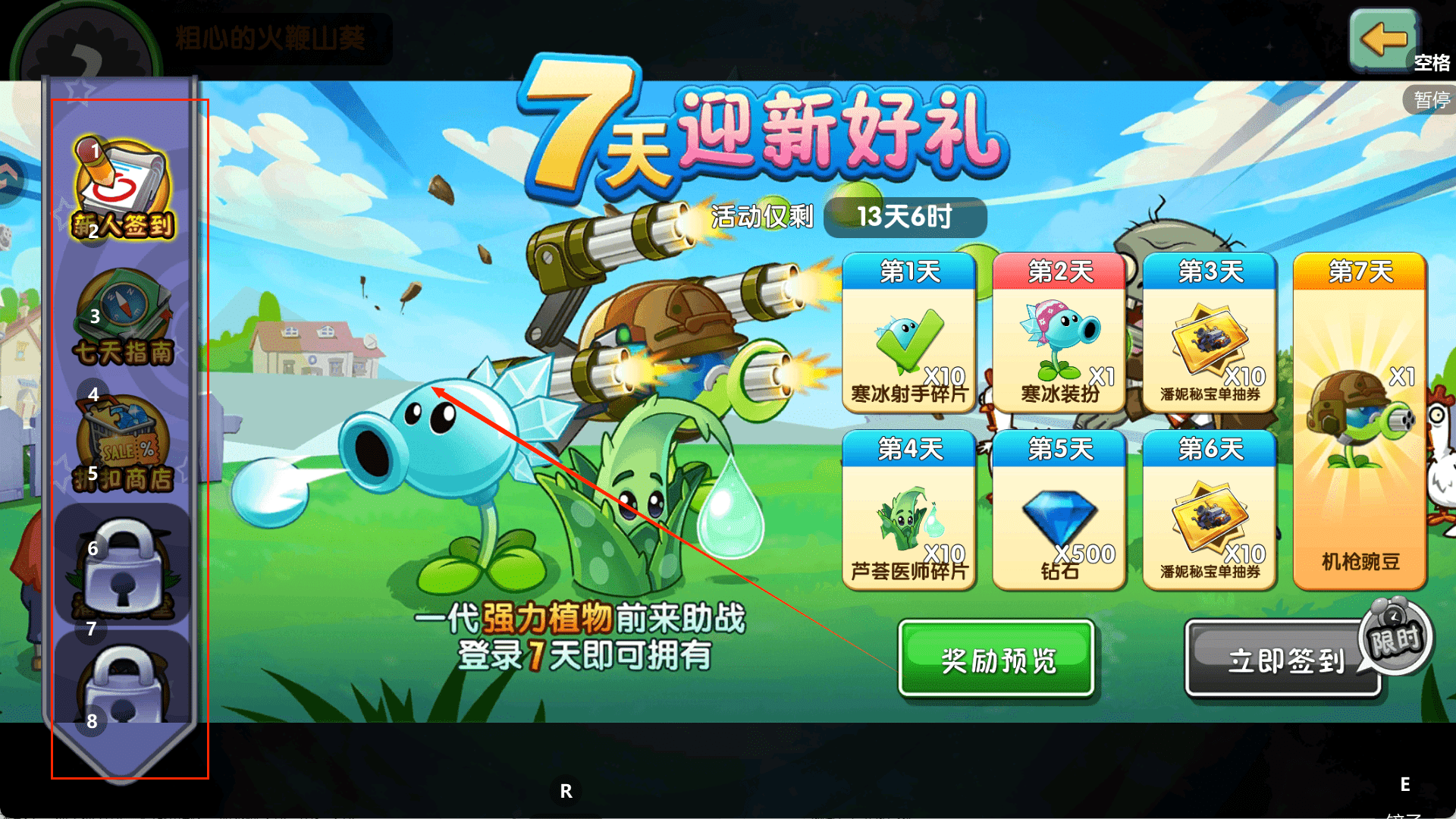 2、坚持完成“新人签到”很重要哦,第2天的寒冰装扮和第6天的潘妮秘宝单抽券都能帮助你获得或强化植物。