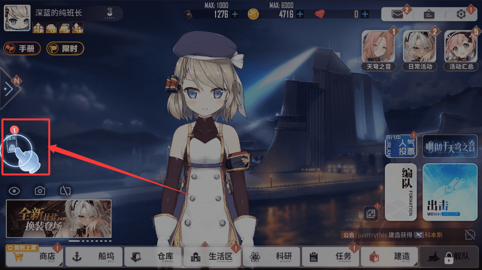 1、点进去,宿舍、食堂、小卖部这些设施都在这里,它们能自动为你的舰娘恢复心情和提供资源,记得定时来收取一下哦。