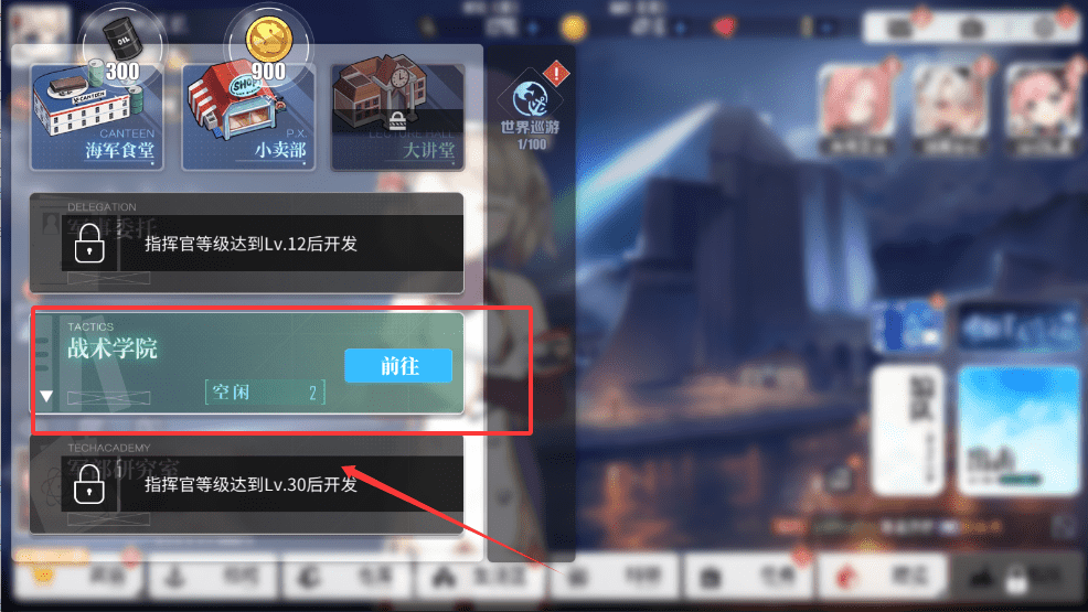 3、你需要不断提升指挥官的等级来解锁更多的房间和设施,比如战术学院,这样就能让更多舰娘同时接受训练,快速提升技能等级了。