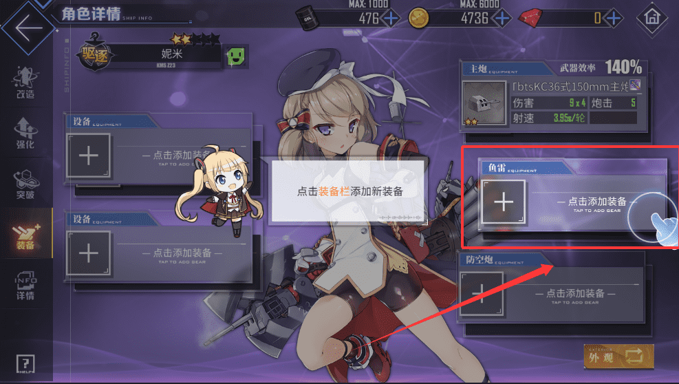 1、点击空白的装备栏位,例如“主炮”或“鱼雷”处,系统会提示“点击添加装备”,这时你就可以进入装备选择界面了。