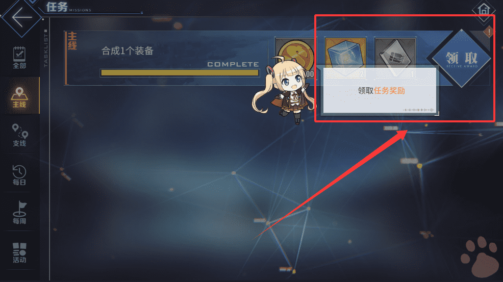 1、完成指定的任务,比如“合成1个装备”,就可以点击“COMPLETE”旁的“领取任务奖励”按钮,获取你的奖励啦。