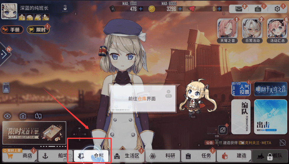 3、日常活动和限时内容也会在“限时”区域提示,新手可以多逛逛“商店”和“船坞”,熟悉各个板块的位置。