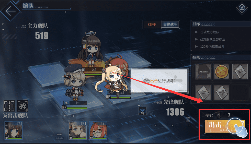 3、可以设置自律战斗自动作战,但要注意达成目标条件,比如全部存活或限时胜利,这样才能拿到额外掉落呢。