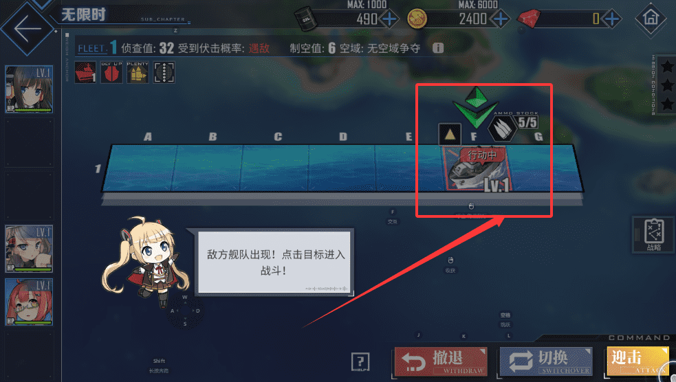 2、地图上有A到G等移动点,点击敌方舰队标志就能进入战斗。如果想撤退或切换舰队,可以使用右下角的对应按钮,避免不必要的损失。