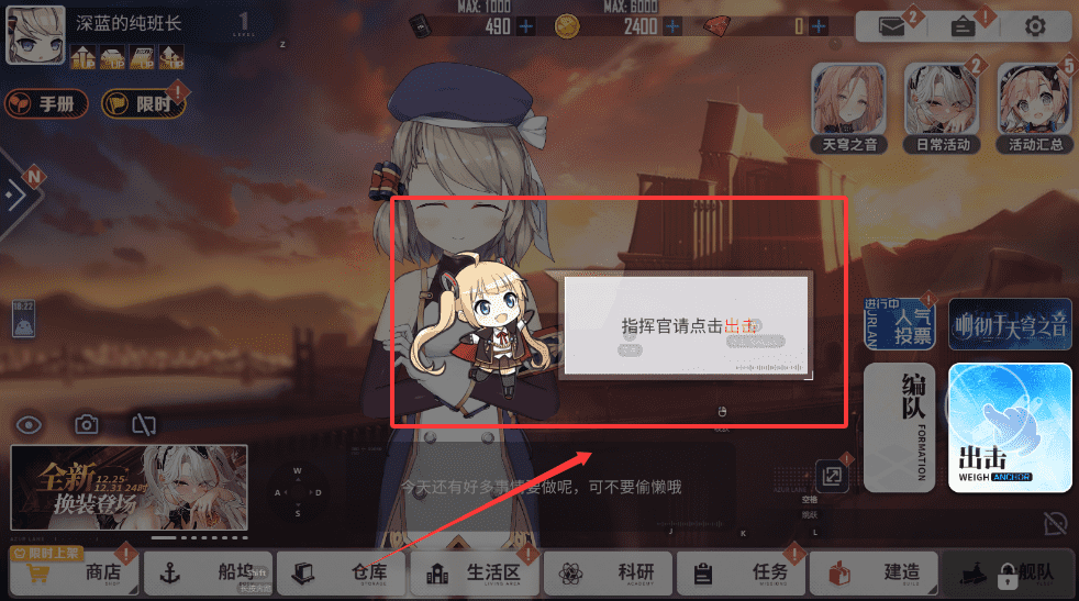1、注意手册里有不同限时活动,商店、船坞、仓库等常用功能都在下方,记得先看看任务和建造有没有新内容哦。