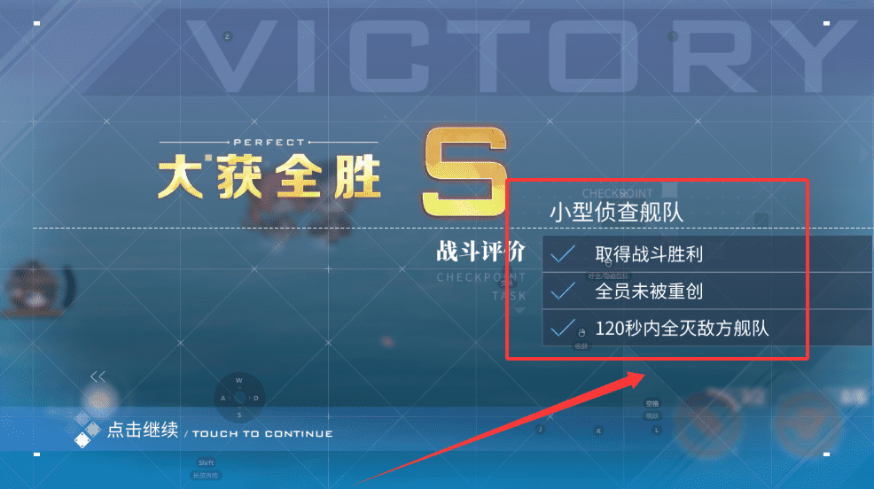 1、记得先查看任务目标,比如“小型侦查舰队”要求120秒内全灭敌人且全员未被重创。完成这些条件才能拿到完美评价,接着点击“点击继续”就能进入下一步了。