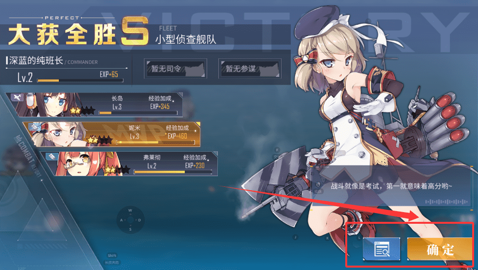 4、结算界面会展示舰队经验与等级提升情况,比如长岛、妮米等角色会显示经验加成,这时候点击“确定”就能保存进度,方便后续继续挑战了。