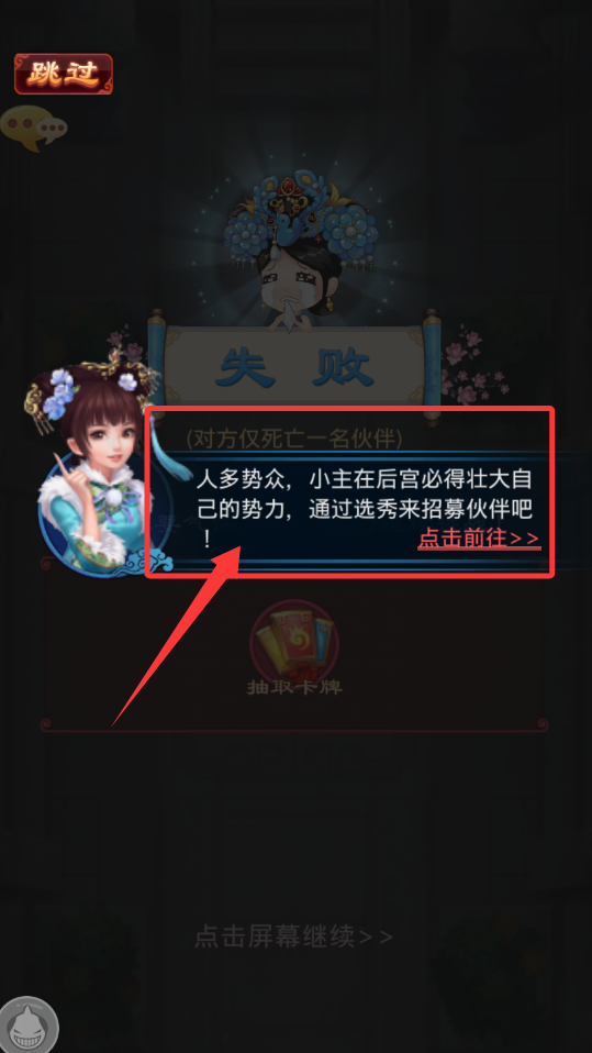 3、若在关卡挑战中失利,界面会明确提示失败原因并给出指引,例如通过“选秀”功能抽取新伙伴以增强势力,招募所得角色将加入队伍。