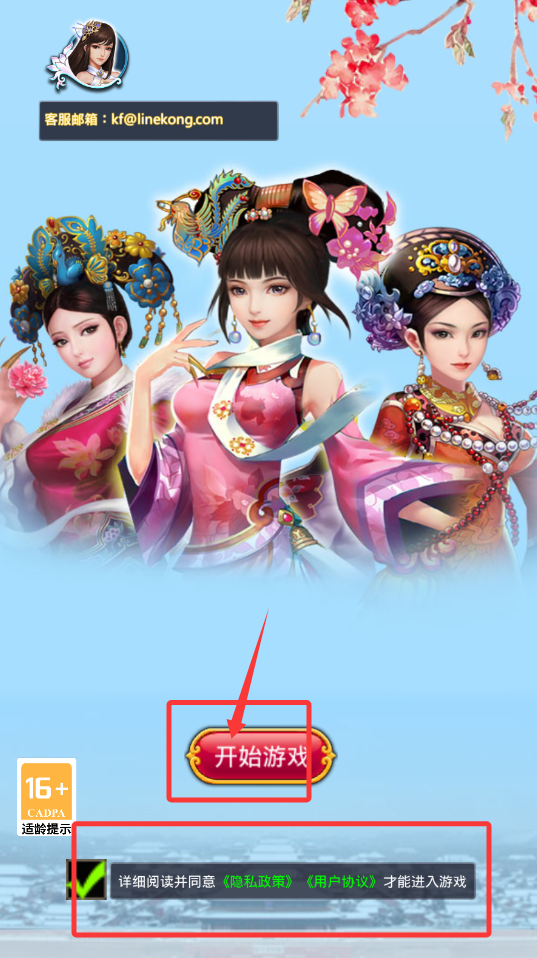 1、启动游戏进入界面后,首先需要确认同意《隐私政策》与《用户协议》,并留意客服邮箱地址,随后点击中央“开始游戏”按钮正式载入。