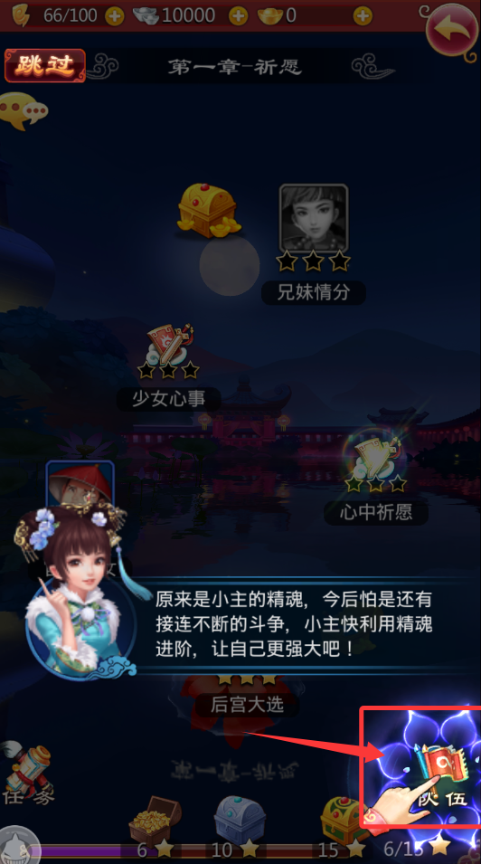 4、开启第一章“祈愿”剧情流程时,系统会自动指引体验“兄妹情分”与“少女心事”等分支故事线,跟随引导更易理解角色关系与宫廷背景设定,并获得完整的新手教学。