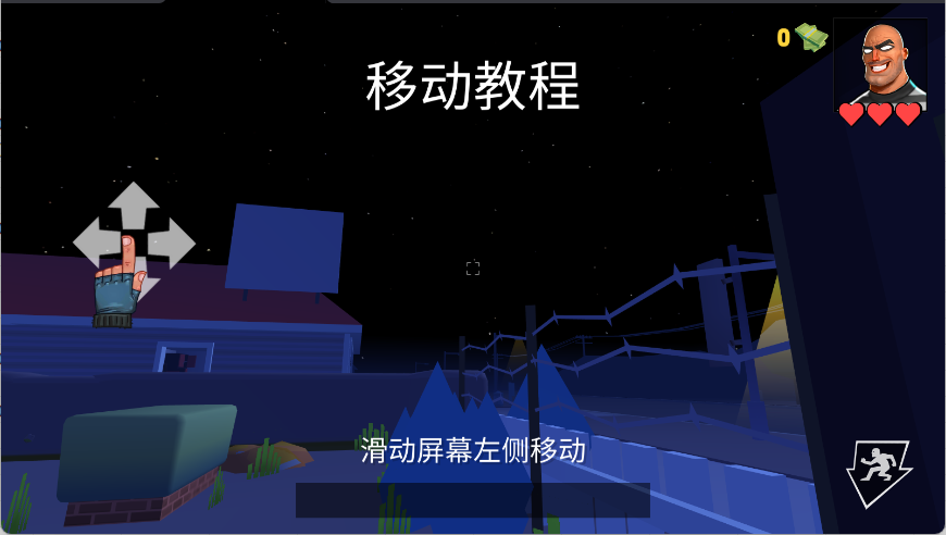 4、继续按照指引,通过滑动屏幕左侧的虚拟摇杆区域控制角色行走与转向。