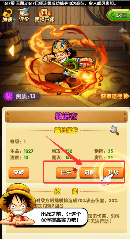 2、完成初始流程并登录后,需将注意力集中于伙伴培养界面。在此可查看伙伴的详细属性,例如生命、攻击与防御等基础数值,以及其独特的技能效果与触发条件。