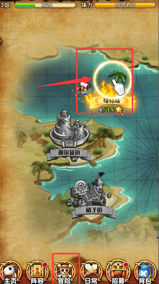 2、通过冒险界面选择并挑战已开放的区域关卡,例如“谢尔兹镇”。成功击败关卡内的敌人后,不仅能收获经验值与金币,还有机会解锁后续的“橘子镇”等新地图与剧情。