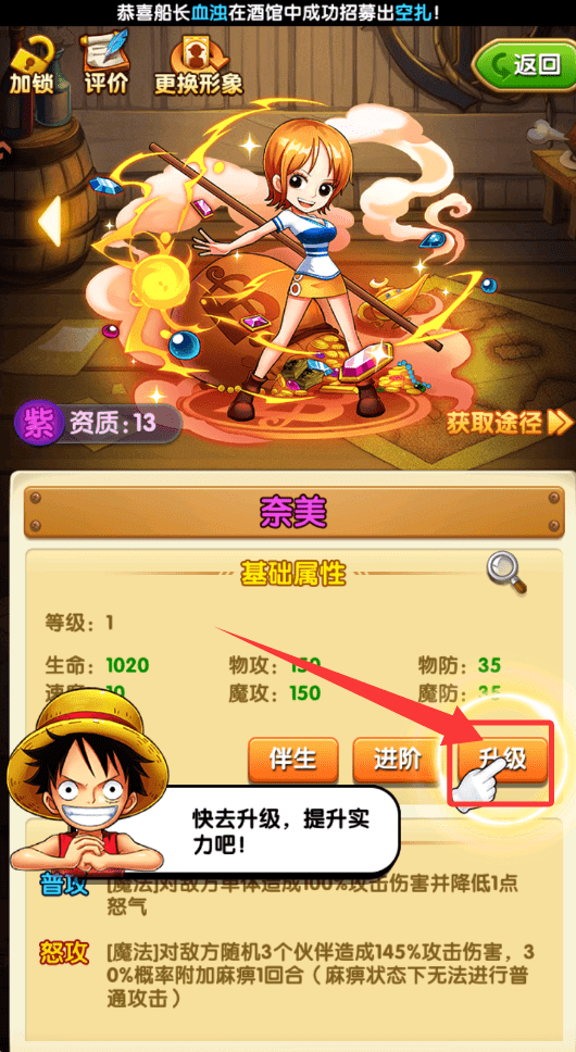 3、成功招募出新伙伴后,如示例中的奈美,应立即前往阵容或伙伴管理界面进行查看。在此界面可以详细查阅其资质、基础属性、智攻与怒攻等技能的具体描述与效果。