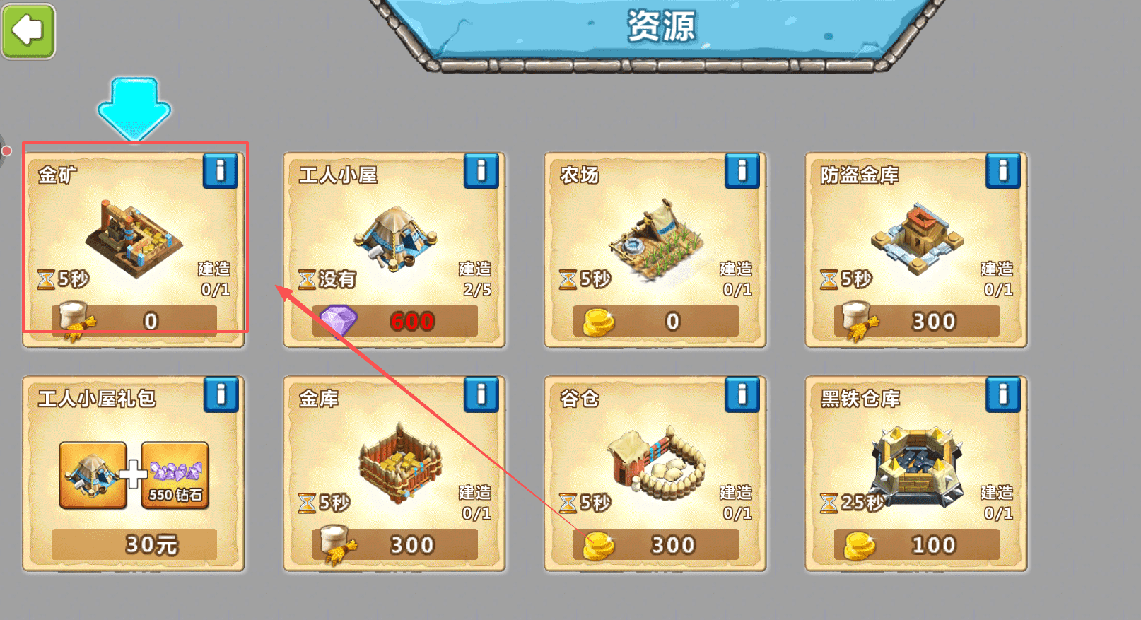 1、优先建造关键资源建筑,比如工人小屋和金矿。建造工人小屋需要5秒时间,建造完成后可以解锁更多建造队列。