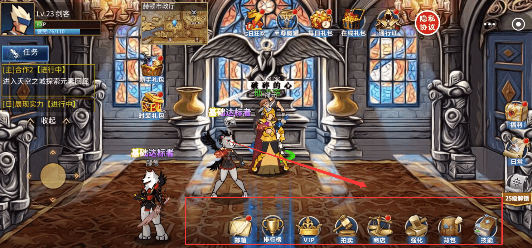 1、进入游戏先看左上角,那里有你的角色等级和疲劳值,记得完成下方任务能快速升级呀。