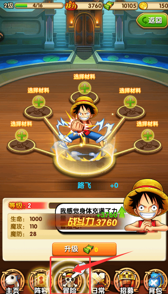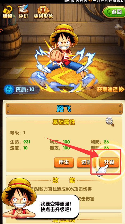 3、点击升级按钮进入强化界面,系统会提示选择消耗材料。通过消耗特定道具或多余伙伴卡片可为目标角色提供经验,成功升级后将直接提升生命、攻击、防御等多项基础属性数值。