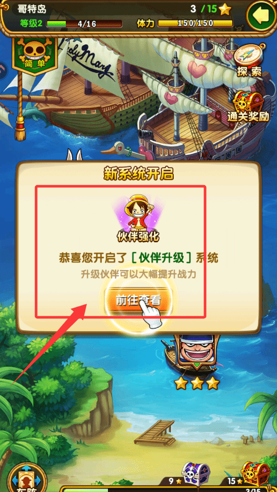 2、跟随主线指引进行初期探索。在主界面点击探索进入关卡,完成首个简单关卡后,将获得通关奖励并解锁新的功能系统,例如伙伴升级功能,此系统对提升队伍作战能力至关重要。