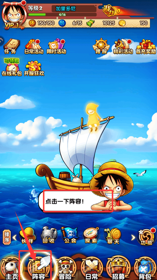 4、界面中央通常设有醒目提示,例如“点击一下阵容”或活动入口。遵循指引点击进入阵容界面,这是管理出战队伍、调整角色位置以及后续进行强化的关键功能区域。