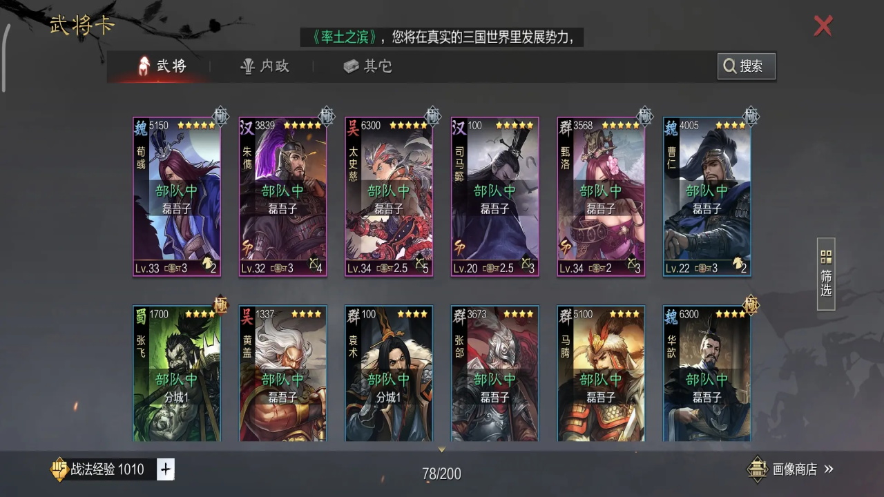 正常打完6块地之后,就卡在了第三章的8块三级地任务上了,此时秒三级校场,三级募兵所,给二队征兵,同时一队征兵也快结束了,结束后,直接拉满征兵。二队一般是在马超,马妹,木鹿,吕蒙,太后,卞夫人,吴夫人之间选择,其中太后/卞夫人/吴夫人为补c工具人,不征兵,如果【战必】跟【先驱】没有被一队占用,如开荒队伍为周泰/张机/关妹等,则二队最好选用马超/木鹿+马妹太后(【先驱+疏数+战必】)的组合,如果【战必】被占用了,那么二队采用吕蒙体系,有【先驱】则用木鹿或者马超,没【先驱】则用马妹,有【磐阵】用【磐阵】,无【磐阵】用【空城】,工具人带【反计】。