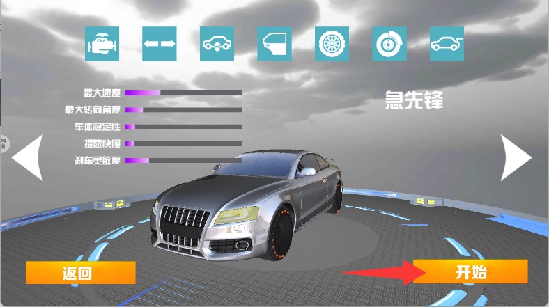 4、在车辆库中挑选心仪的跑车或经典车型,点击确认后进入改装工坊开始调整。