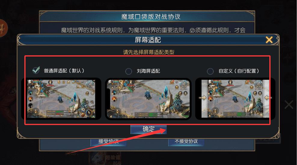 1、首次开启时,需阅读对战协议并根据手机屏幕选择适配模式,点击确定即可哦。