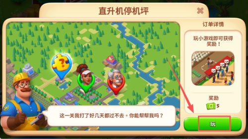 1、在直升机停机坪界面,点击订单旁的 “玩” 按钮,进入游戏环节开始进行关卡。